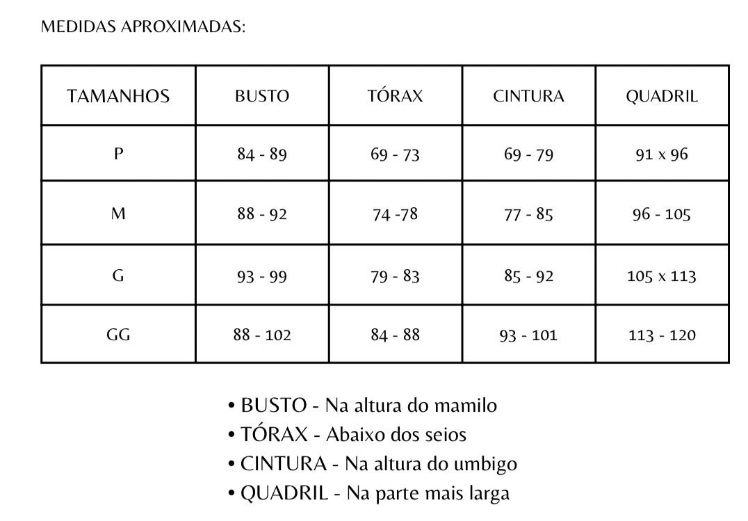 OBS: Devido a elasticidade dos tecidos as medidas acima são aproximadas, não exatas. Na dúvida entre 2 tamanhos, opte sempre pelo maior, assim você terá mais conforto. A Renda possui bastante elasticidade.